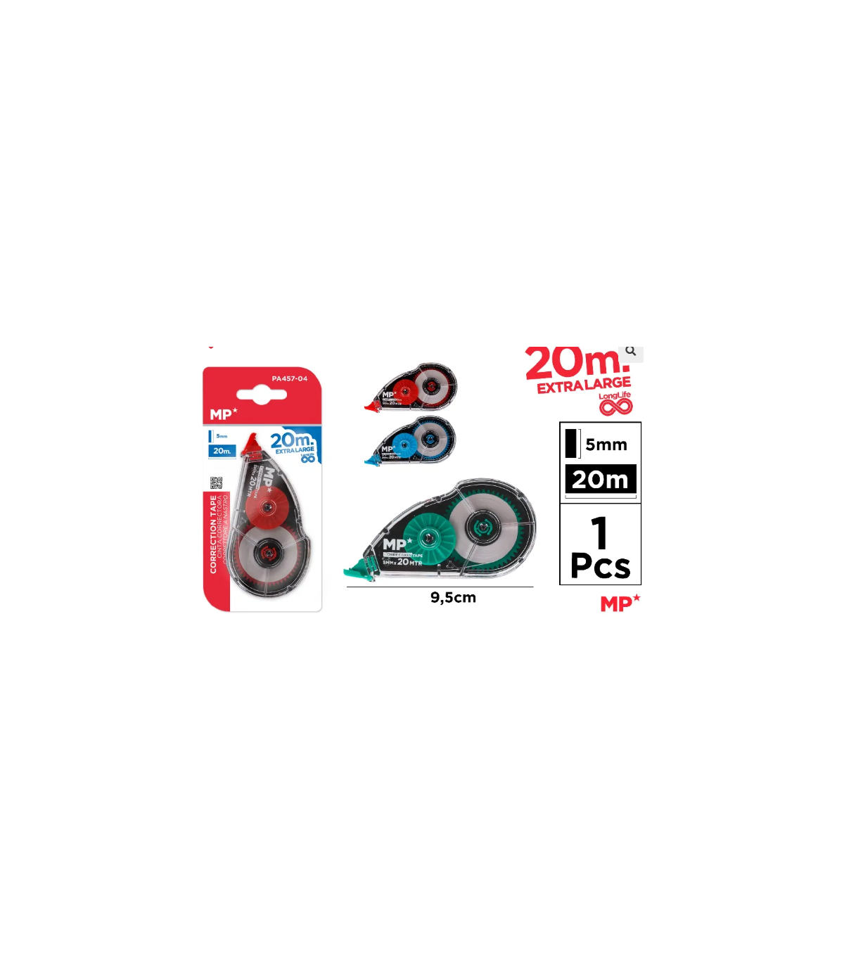Cinta correctora en seco extralarga. Permite la escritura sobre ella al instante. Gran opacidad. Corrección frontal. No tóxica. Se desliza suavemente sobre el papel sin atascos. Ancho de la cinta: 5 mm. Longitud: 20 m.