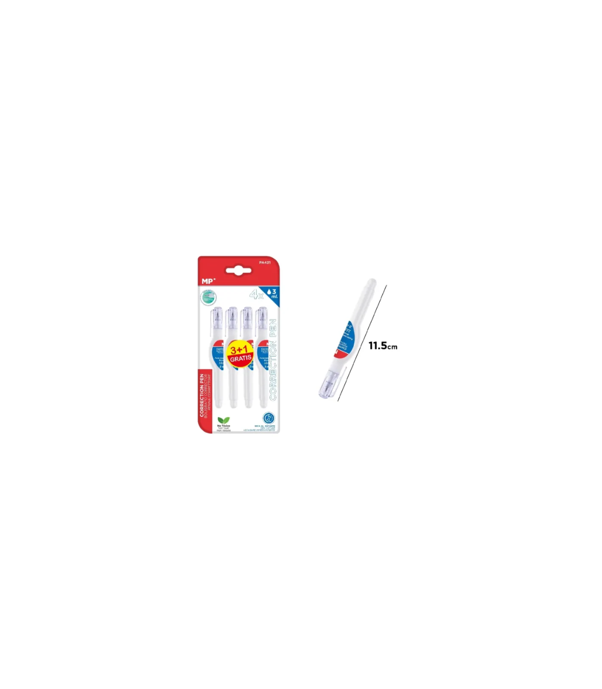Corrector tipo bolígrafo de gran precisión. No tóxico. Puede escribir como un lápiz. Se controla el flujo presionando el cuerpo del bolígrafo. Secado rápido que permite reescribir rápidamente. Punta metálica fina de 1-2 mm. Bolígrafo de 3 ml. Blíster de 4 unidades.
