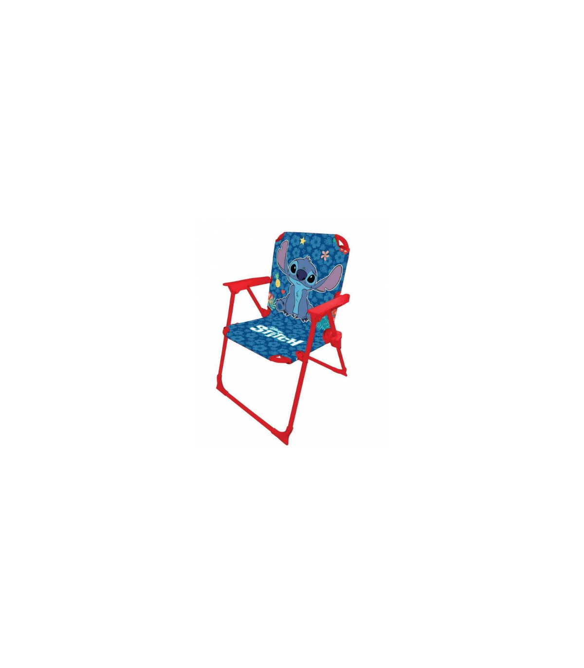 Práctica, ligera y resistente, esta sillita plegable con diseño de Stitch es ideal para exteriores, playa o jardín. Tiene estructura metálica, asiento de tela y reposabrazos.